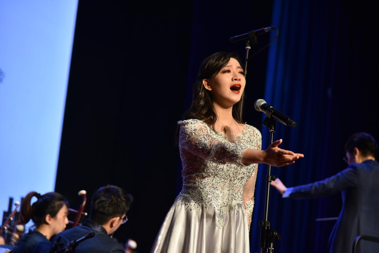 第二幕演奏的乐曲则更富多元文化色彩和地方特色,以《龟兹盛歌》为始。龟兹乐舞是丝绸之路上多元文化汇集中的一颗璀璨明珠,它对世界音乐文化的影响极其深远。这首曲子选用《瑞鹧鸪》片段为主要音乐素材,表达出乐舞相伴、盛世放歌的宏大景和豪情。紧接着一首赞颂华夏先民,展现美丽文化意象,《百鸟朝凤》用热情欢快的旋律描绘了百鸟和鸣之声,表现了生机勃勃的大自然景象。上海音乐学院刘雯雯老师用唢呐短促的吐音和高尖的滑音,极富技巧地模仿了“群鸟齐鸣,凤凰高飞”的意境,长音技巧的华彩乐句赢得了全场师生的热烈掌声。蝉鸣一段中,伴奏音乐突然停止,唢呐运用忽强忽弱的力度变化和循环换气的长音演奏,让人仿佛置身夏夜、回味无穷。随后,美声作品《英雄颂歌》、管弦乐《延河随想》又将观众带入那个延河滚滚、宝塔巍巍的年代情境,热情讴歌了永不褪色的延安精神,表达了对英雄儿女的赞美。