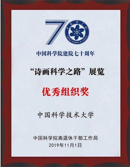 为隆重庆祝新中国成立70周年和中科院建院70周年,院离退休干部工作局自2019年4月开始相继开展了“我看新中国成立70周年和中科院建院70周年新成就”微视频、摄影作品大赛,以及庆祝建国建院70周年征文作品征集等活动。我校离退休干部工作处积极组织感兴趣的离退休教职工进行作品创作和统一评审,最终向院局报送了12幅摄影作品、2个微视频、1篇回忆文章和4首诗作。由于组织有力,我校被中科院离退休干部工作局授予中国科学院建院七十周年“诗画科学之路”展览优秀组织奖。