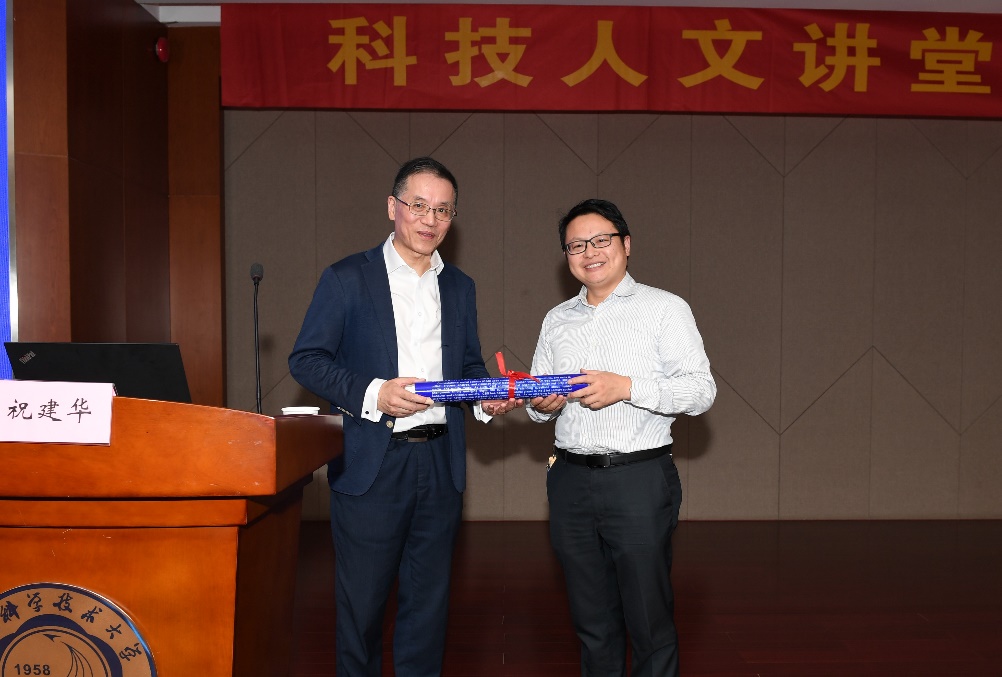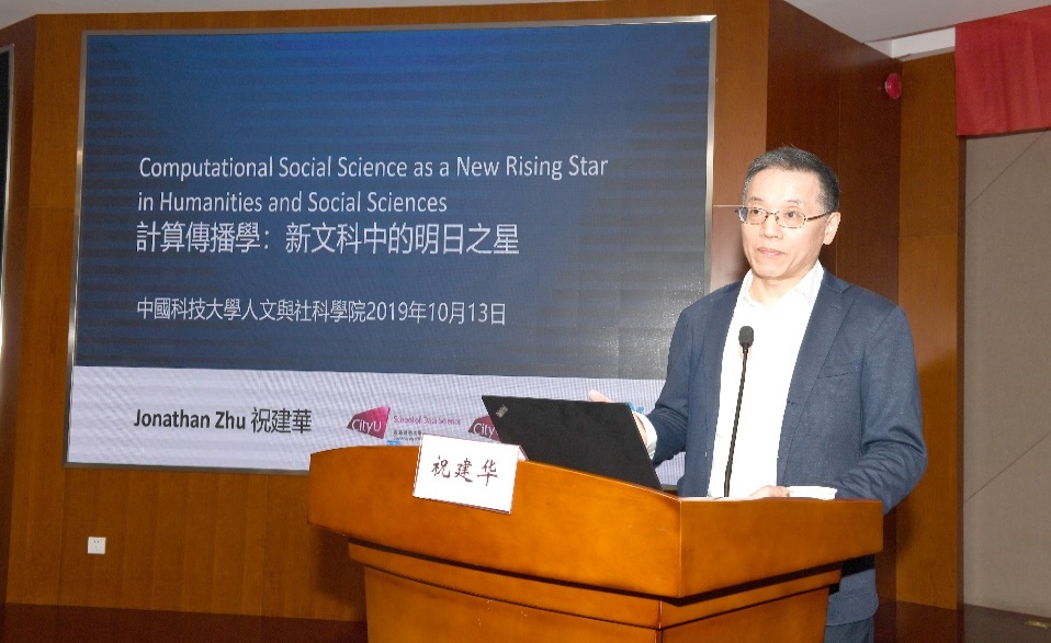 10月13日周日晚7点,中国科大“科技人文讲堂”邀请到世界知名传播学者祝建华教授在我校东区师生活动中心五楼国际报告厅做了题为“计算社会科学:新文科的明日之星”的专题报告。这是继国家博物馆原副馆长陈履生、世界知名语言学家王士元院士之后,“科技人文讲坛”系列报告会邀请到的又一位重量级学者。人文与社会科学学院党委书记褚建勋主持报告会,并向祝建华教授赠送了“科技人文讲坛”海报纪念版。