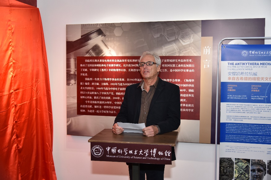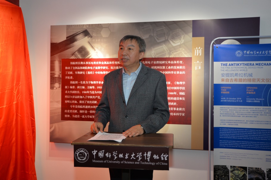 舒歌群书记在致辞中指出,钱临照先生是我国著名的物理学家、教育家。他长期从事压电效应和金属晶体形变机理研究,在国内首先用电子显微镜研究单晶体形变,推动了全国晶体缺陷、电子显微学研究和科学技术史等领域的研究,对我国科技和教育事业做出了重要贡献。1958年在我校创办之初,钱先生就来学校工作,他亲自登台授课,培养了大批科技英才。1970年,钱临照先生随科大南迁合肥,是当时随学校南迁的仅有的两名院士之一。在学校第二次创业中,钱先生发挥了重要作用。钱先生的后半生与学校同呼吸共命运,直到1999年在他深爱着校园中离世。钱临照先生是新中国第一代归国科学家的杰出代表,科教报国、潜心执教的楷模。在钱先生逝世20周年之际,校博物馆举办这个展览,深切缅怀老一辈科学家爱国情怀和奉献精神,激励我校广大师生不忘初心、牢记使命,潜心立德树人、执着攻关创新,树立科学报国之志,以真才实学服务人民,以创新创造贡献国家。接着,舒歌群书记指出,从科技发展历史看,近代科学的源头在古希腊。安提凯希拉机械正是公元前二世纪古希腊的天文学理论水平和仪器制作工艺的集中体现。希望广大师生,通过近距离观看本次展览,领略古代西方科学技术发展的文明成果,提升科技人文素养,丰富校园文化氛围。