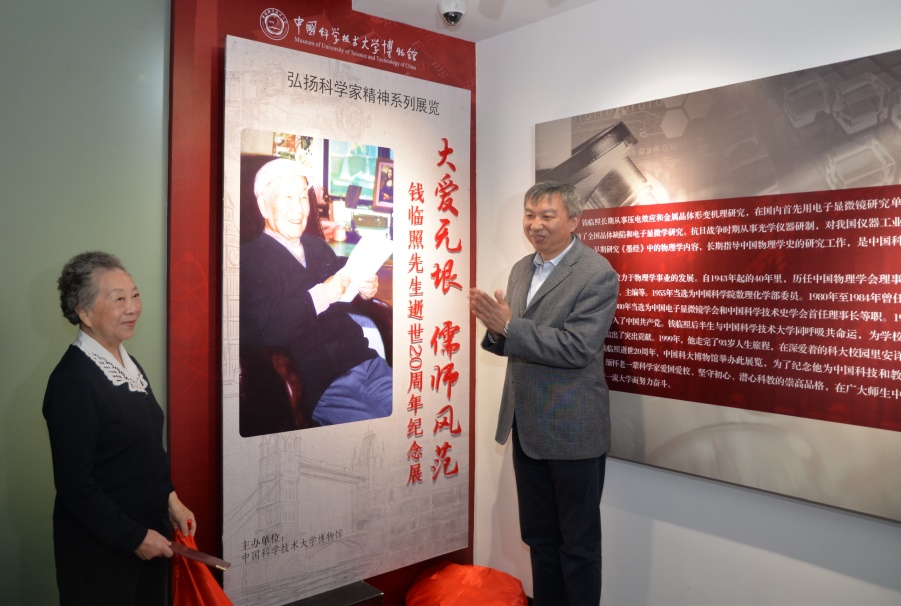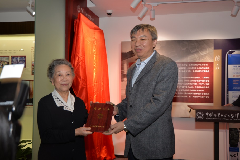 钱平凯教授把钱临照先生生前的大量藏书、手稿、照片及个人用品等珍贵实物捐赠给中国科大博物馆。舒歌群书记为钱平凯教授颁发了捐赠证书。之后他们共同为展览揭幕。