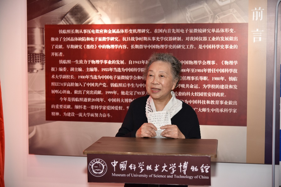钱平凯教授在致辞中提到,钱临照先生一生爱国敬业。抗战期间,他在艰苦环境中仍然笔耕不辍。其名作《释墨经中之光学力学诸条》即完成于昆明黑龙潭草屋的一盏煤油灯之下。1970年,他积极投身于中国科大二次创业之中。钱先生将其后半生的时光献给中国科大,把校园当成自己的“家”。钱先生在病危之际,坚持回到科大校医院,以实现他“故于科大校园”的愿望。校博物馆在筹办展览的过程中,到我家来找寻钱先生生前用过的物品和学术资料等,我愿意把这些物品捐献给校博物馆永久保存,这不仅是我们家属的愿望,也一定是钱临照先生本人的愿望。这些物品不是被“捐赠”给中国科大的,而是“回归”中国科大。