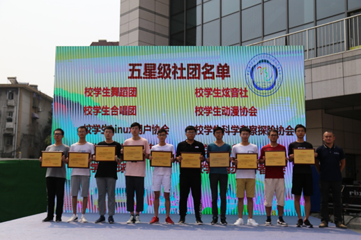 校学生舞蹈团等10家学生社团荣获2018-2019学年五星级社团称号,校团委副书记赵林为获奖社团代表颁发荣誉奖牌。
