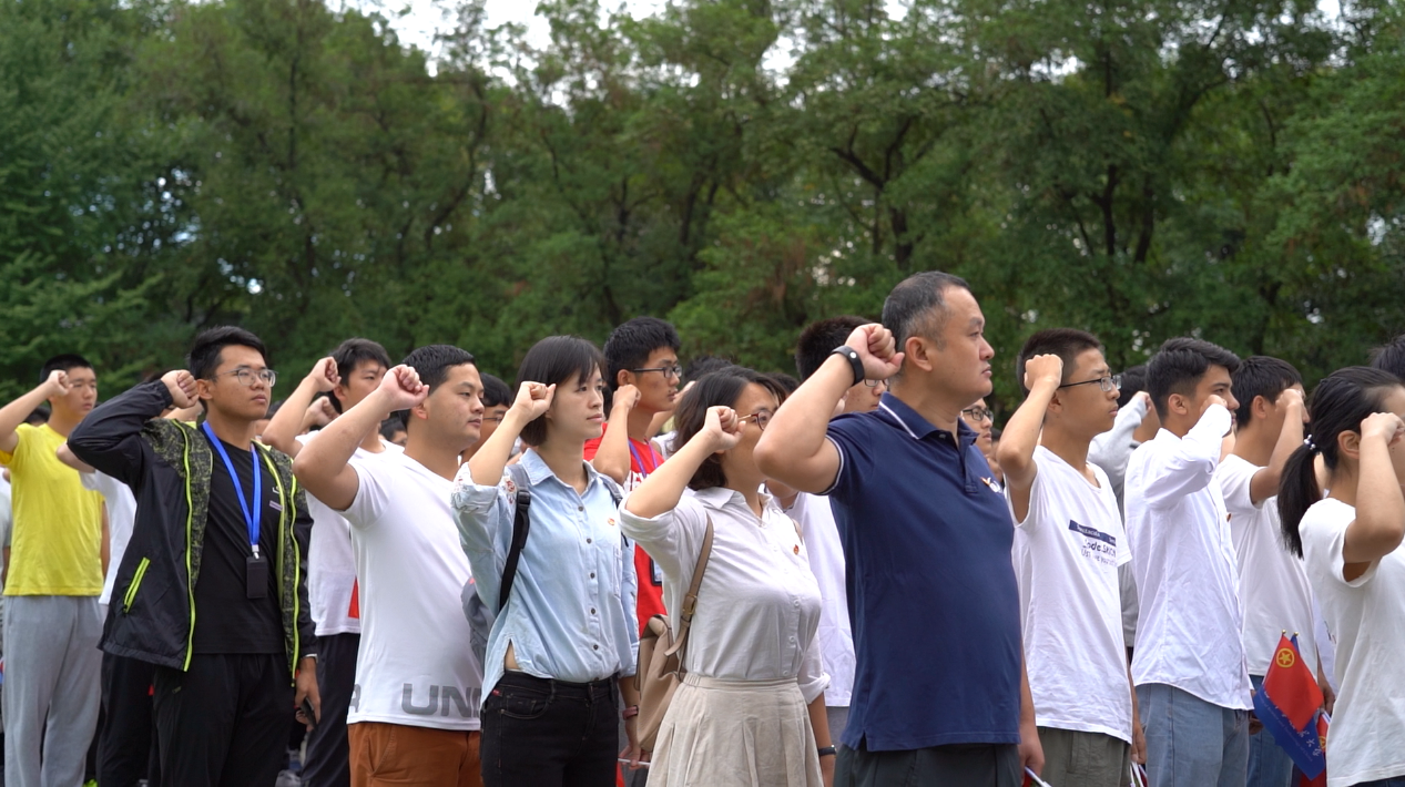 升旗仪式最后一项,全体师生重温入团誓词。校学生国旗护卫队出中国共产主义青年团团旗,参加仪式活动的全体师生集体宣誓,用青春之声和坚定的理想信念告白祖国。
