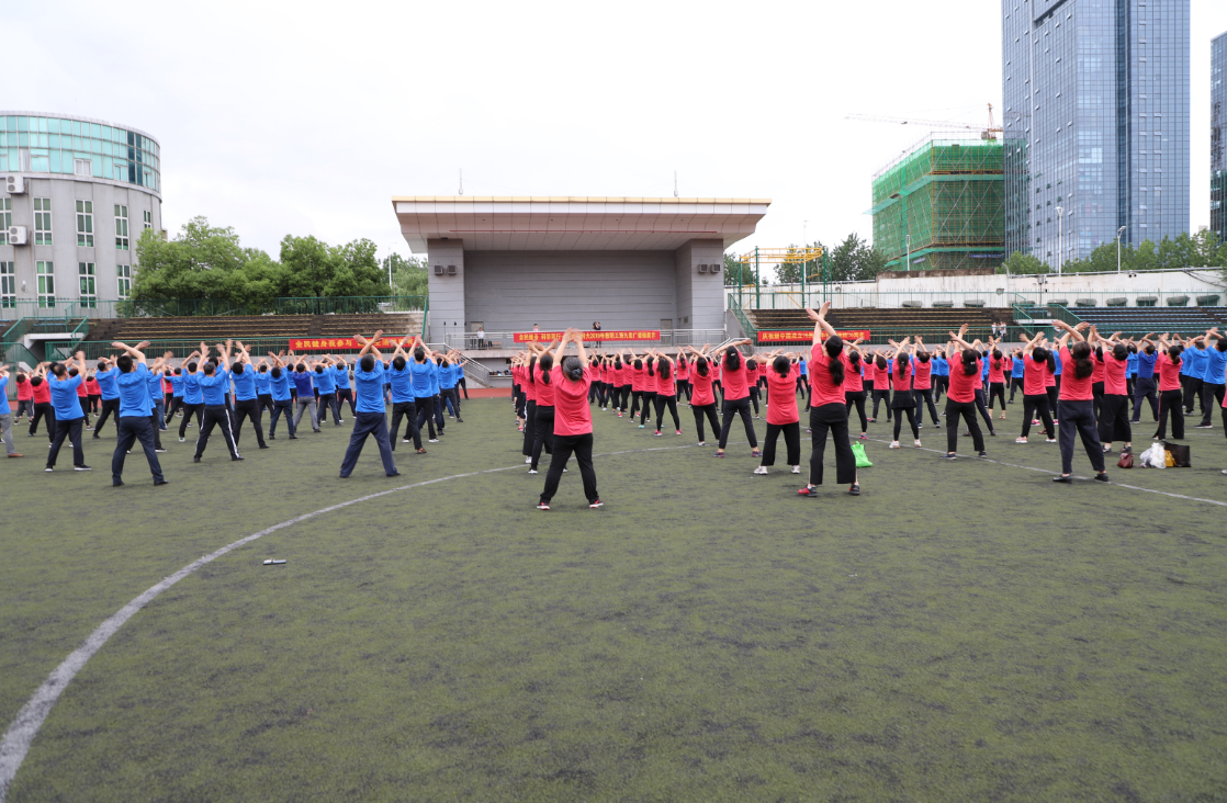 为庆祝新中国成立70周年和中科院建院70周年,响应中科院体协“以推广普及广播体操为重点,在全院范围开展中国科学院第八届‘全民健身日’活动”的号召,6月18日下午,校工会在东区操场组织了第九套广播体操集体展示活动,全校近400名教职工参与。