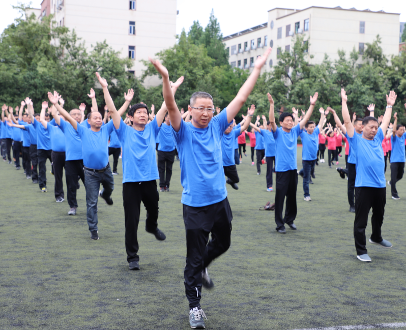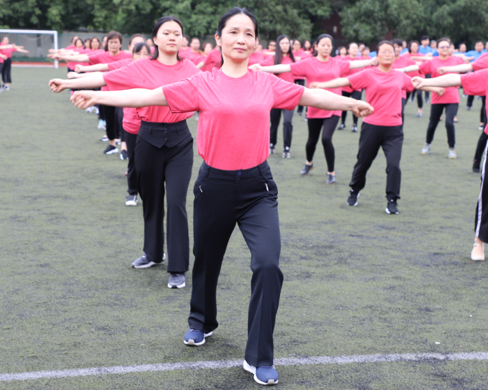 教职工们统一着装,列队整齐,个个精神饱满,神采飞扬。“第九套广播体操现在开始,原地踏步走,一二三四……”伴随着熟悉的、富有节奏的音乐,大家踏着规范有力的步伐,伸展、弯腰、踢腿、跳跃,每个动作都力求标准到位、刚健有力,举手投足间尽显风采,充分展示出体操的力与美。