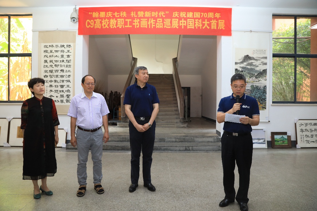 舒歌群代表学校对C9高校书画巡展在我校首展表示热烈祝贺。他说C9高校作为我国“双一流”建设第一方阵,不仅要在人才培养和科学研究上取得骄人的成绩,同时在校园文化建设上也应发挥带头作用。我校一直有着良好的书画艺术氛围,老一辈的科大人中不乏书画大家,其中我校的老校长郭沫若先生就是一位著名的书法家。希望借助此次巡展促进C9高校间的文化交流,同时进一步提高我校教职工的文化修养,推动我校校园文化建设更上一层楼。最后,舒歌群宣布“‘翰墨庆七秩 礼赞新时代’庆祝建国70周年C9高校教职工书画作品巡展中国科大首展”开幕。