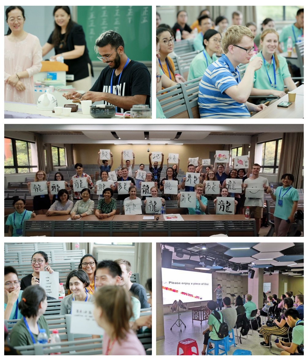营员们还参加了茶艺、饮食、书法、乐器等中国传统文化课程。茶艺课上老师将众人分组然后先后讲述了茶的起源、发展等内容,并在互动环节请了一位志愿者和一位营员上台展示如何泡茶。饮食文化课上老师将营员和志愿者们分了组,以知识竞猜的形式,介绍了中华饮食的历史渊源、菜系分布和背后的哲学内涵。营员表示想在下课后去体验一下川菜等中华美食。书法课上营员一起欣赏了关于书法的纪录片,通过知识竞赛的形式,营员们学习了书法的各种形式及国画的体系。最后,营员们在老师的指导下,完成了“龙”的书法作品和国画。民乐介绍课上,民乐团的同学为营员们展示了各种乐器的声音和独奏,还让营员们竞猜判断音频中的乐器,趣味盎然。