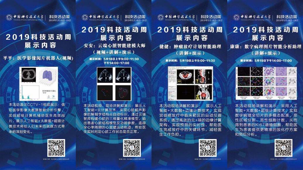 5月18-19日,中国科大计算机学院的“平平、安安、健健、康康”四位科普大使集体亮相,向社会公众展示了超级计算与人工智能、大数据分析等尖端和前沿计算机技术相结合将如何改变临床医学的未来。