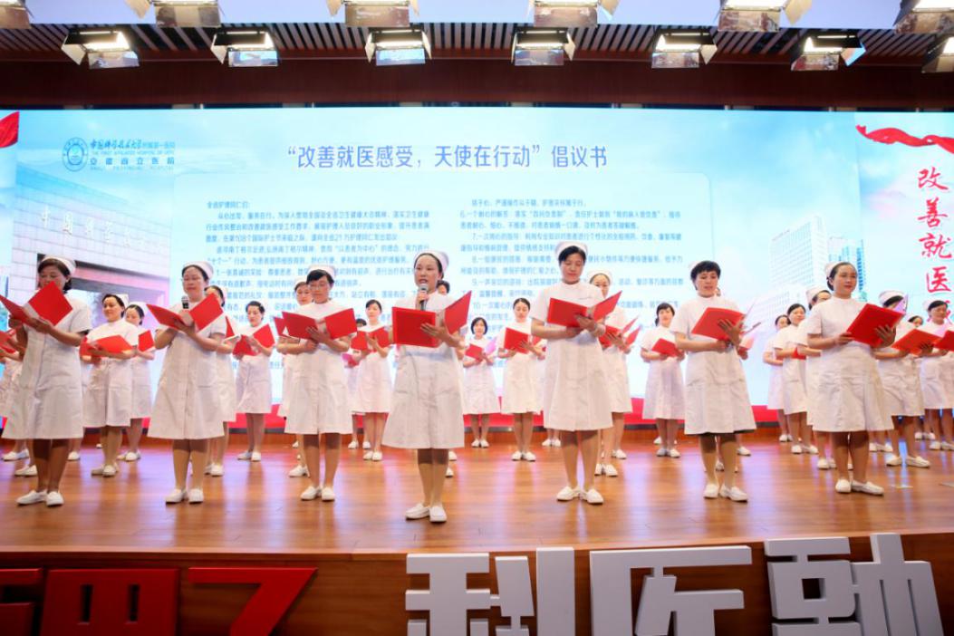 胡珏在讲话中指出,护理服务是健康中国建设的重要内容,与人民群众的健康权益和生命安全密切相关,对促进健康服务业发展、保障和改善民生具有积极意义。改善护理服务,提高护理质量,是深化医改、惠民便民的重要举措。希望护理工作者积极响应省卫健委“十个一”服务倡议,将改善医疗服务、提高人民群众健康获得感作为卫生行业现阶段的重要工作,以群众健康为中心,以社会需求为导向,深入推进优质护理服务。为积极响应倡议,护理部主任储爱琴带领集团57名护理管理人员宣读了省卫健委及省护理学会《改善就医感受,天使在行动》倡议书,现场反应热烈。