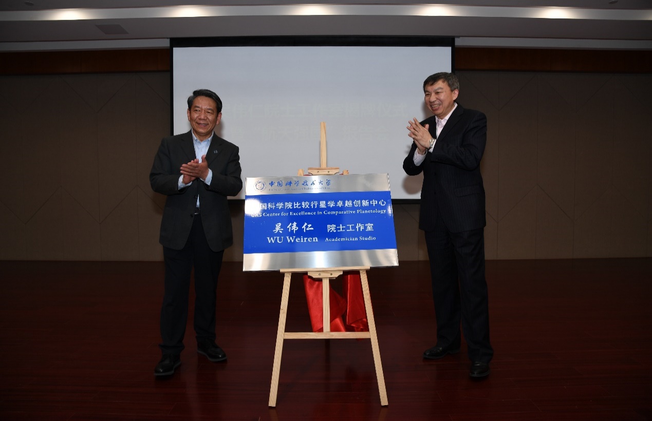 报告会前,举行了简短的吴伟仁院士工作室揭牌仪式。舒歌群书记和吴伟仁院士共同为工作室揭牌,包信和校长为吴伟仁院士颁发聘书。该工作室建设的目标是:加速突破融合深空探测的关键科学与技术,结合我校在地球和行星研究、信息和自动化控制领域的优势学科,加大吸引高水平的青年研究人员,探索新的人才培养和团队合作模式,推动建设一个具有国际影响力的深空探测科教融合的中心。