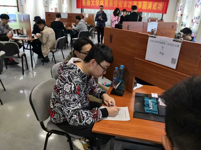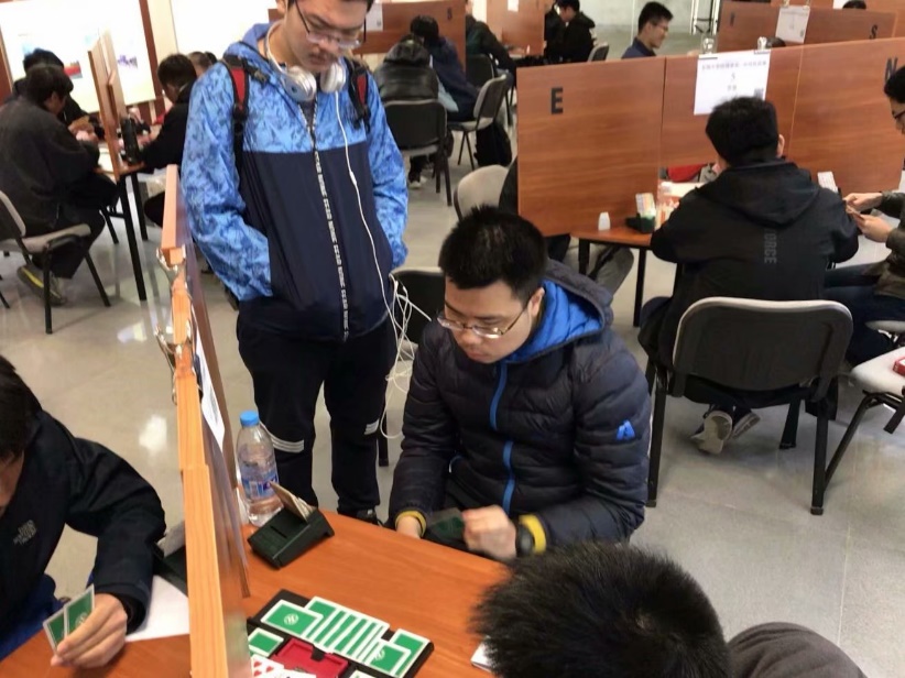 3月22日晚,我校代表队抵达南京,并在东南大学附近的酒店中进行了赛前最后的准备。3月23日上午,公开团体赛正式开赛。比赛采取瑞士移位赛制,共6轮比赛,每轮8副牌。我校派出的代表队由三组搭档组成:贺晟/张峰瑞、徐诚超/刘静远、吴天/王洪岩。
