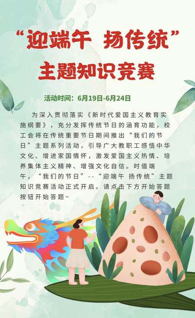 6月19日,“我们的节日”——“迎端午 扬传统”线上主题知识竞赛正式启动。本次知识竞赛内容主要是围绕有关端午佳节的民俗知识和诗词歌赋,采用在线随机抽取作答。活动得到了基层工会热烈响应,广大教职工参与兴致高涨,院士、多名知名学者和校领导积极参加答题,也吸引到数名外籍教职工参与进来。