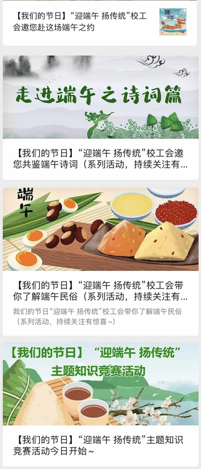 2020年6月16日至6月18日,校工会在微信公众号上连续发布数期端午主题推文,带领大家回顾传统节日,学习古今经典,重温历史情怀,感受文化魅力。