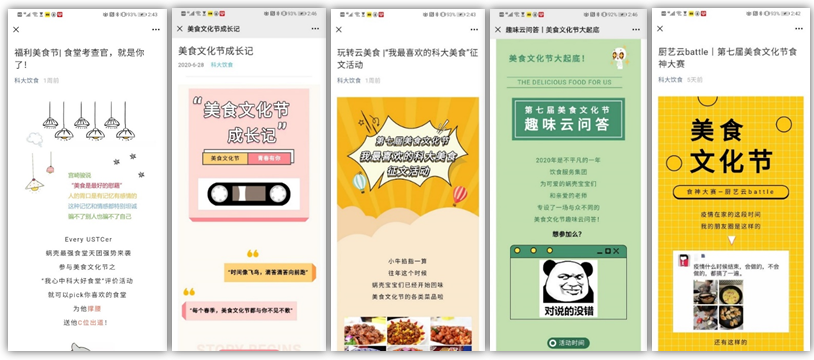 6月中旬,第七届美食文化节以“玩转云美食——我最喜欢的科大美食征文”活动正式启动,后续又陆续在“科大饮食”微信号推出了“厨艺云battle——第七届美食文化节食神大赛”、“美食文化节成长记”、“趣味云问答——美食文化节大起底”、 “福利美食节——食堂考查官”、“云上美食节——《科大食堂欢迎你》MV”、“科大吃播来喽”共七个主题的活动,活动共持续一个半月。