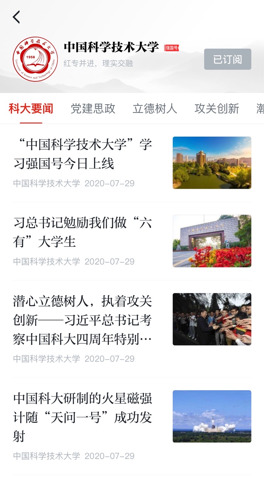 在校党委的领导下,“中国科学技术大学”学习强国号依托学校党委宣传部管理运营,设立科大要闻、党建思政、立德树人、攻关创新、瀚海星云、光影科大六个栏目,将传播中国科大各项工作的最新资讯,弘扬科学家精神,展示科大师生潜心向学、执着创新的精神风貌,展现中国科大校园之美。