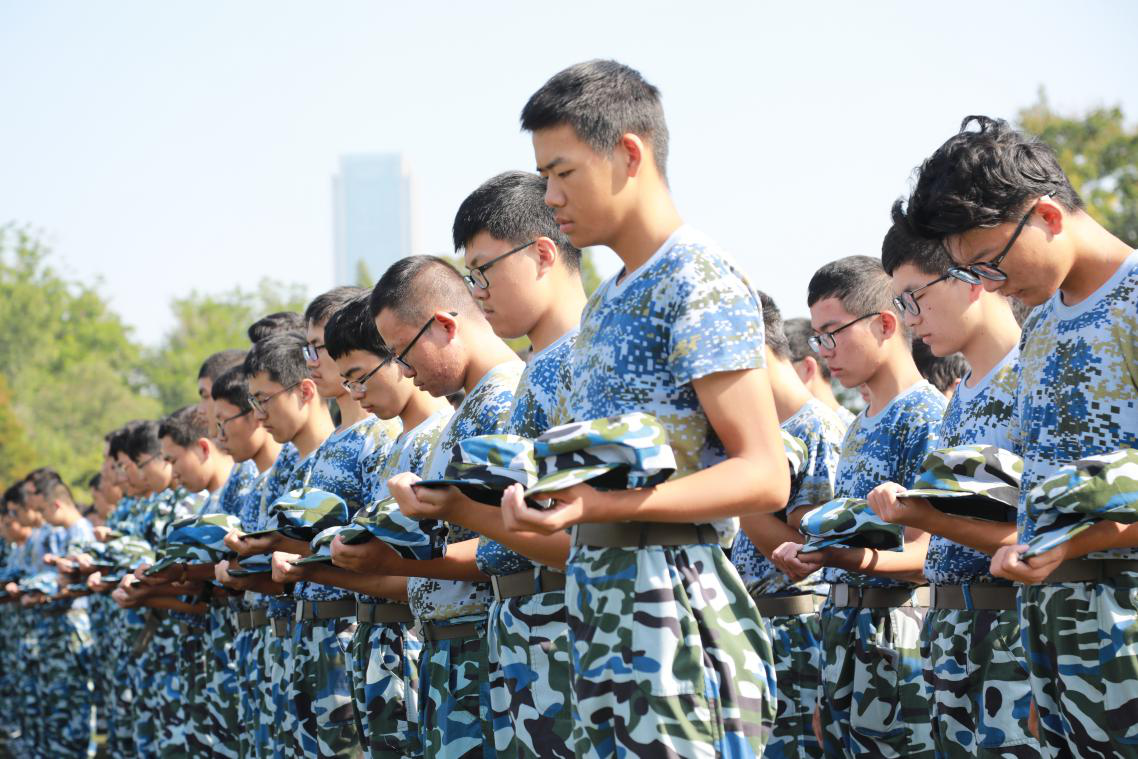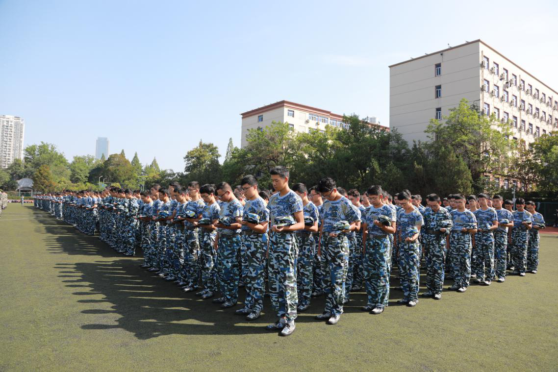 九点十八分,军训团在防空警报鸣响时肃立默哀。