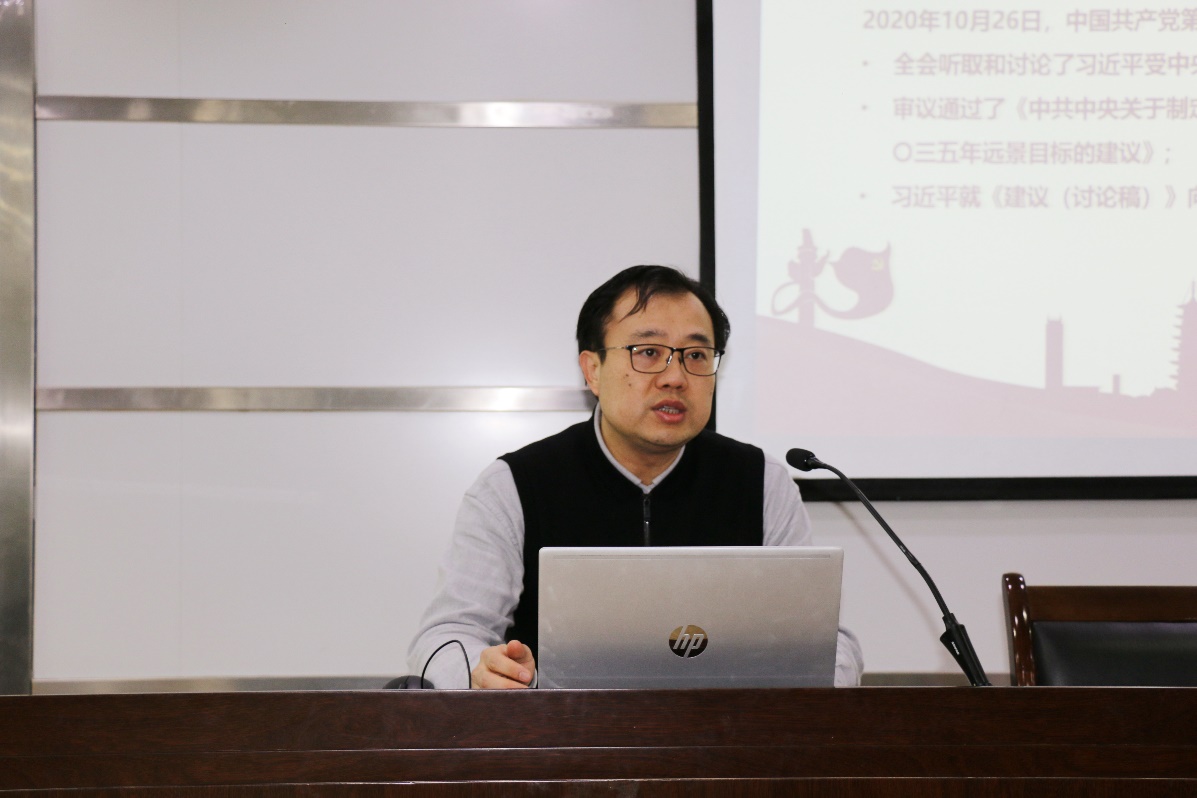 宣讲报告会上,傅尧首先回顾了党的十九届五中全会召开的基本情况和重大意义,强调了党的十九届五中全会是在即将实现第一个百年奋斗目标、开启全面建设社会主义现代化国家新征程的时刻召开的一次十分重要的会议。会议审议通过了《中共中央关于制定国民经济和社会发展第十四个五年规划和二〇三五年远景目标的建议》,对二〇三五年目标、对“十四五”时期经济社会发展作出了系统谋划和战略部署。会议擎画了未来5年乃至15年中国发展的宏伟蓝图,开启了全面建设社会主义现代化国家新征程。会议强调加快构建以国内大循环为主体、国内国际双循环相互促进的新发展格局,推进国家治理体系和治理能力现代化,实现经济行稳致远、社会安定和谐,为全面建设社会主义现代化国家开好局、起好步。