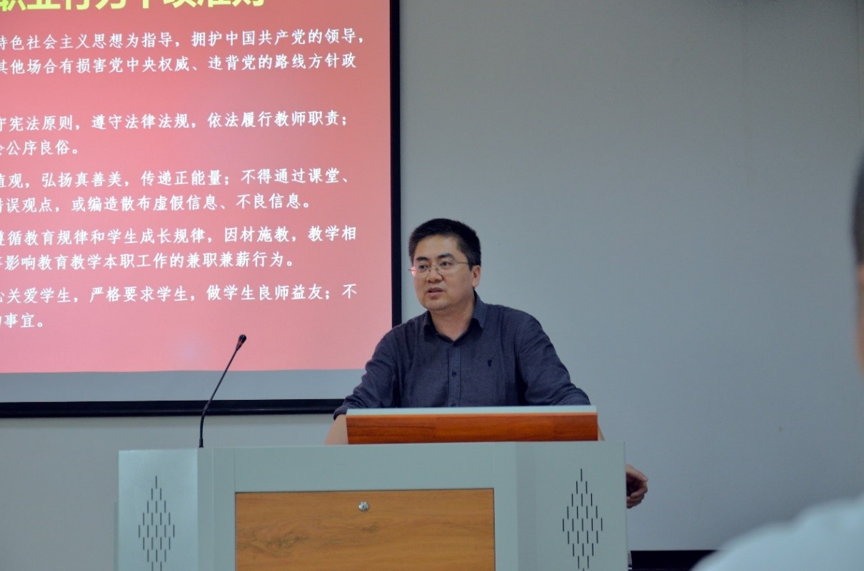 胡芃首先带领全体教工学习了《新时代高校教师职业行为十项准则》《教育部关于高校教师师德失范行为处理的指导意见》《关于进一步弘扬科学家精神加强作风和学风建设的意见》等文件精神,传达了院党委成立师德师风建设工作小组的通知,要求全体教工把潜心立德树人和执着攻关创新结合起来,积极推进师德师风建设。