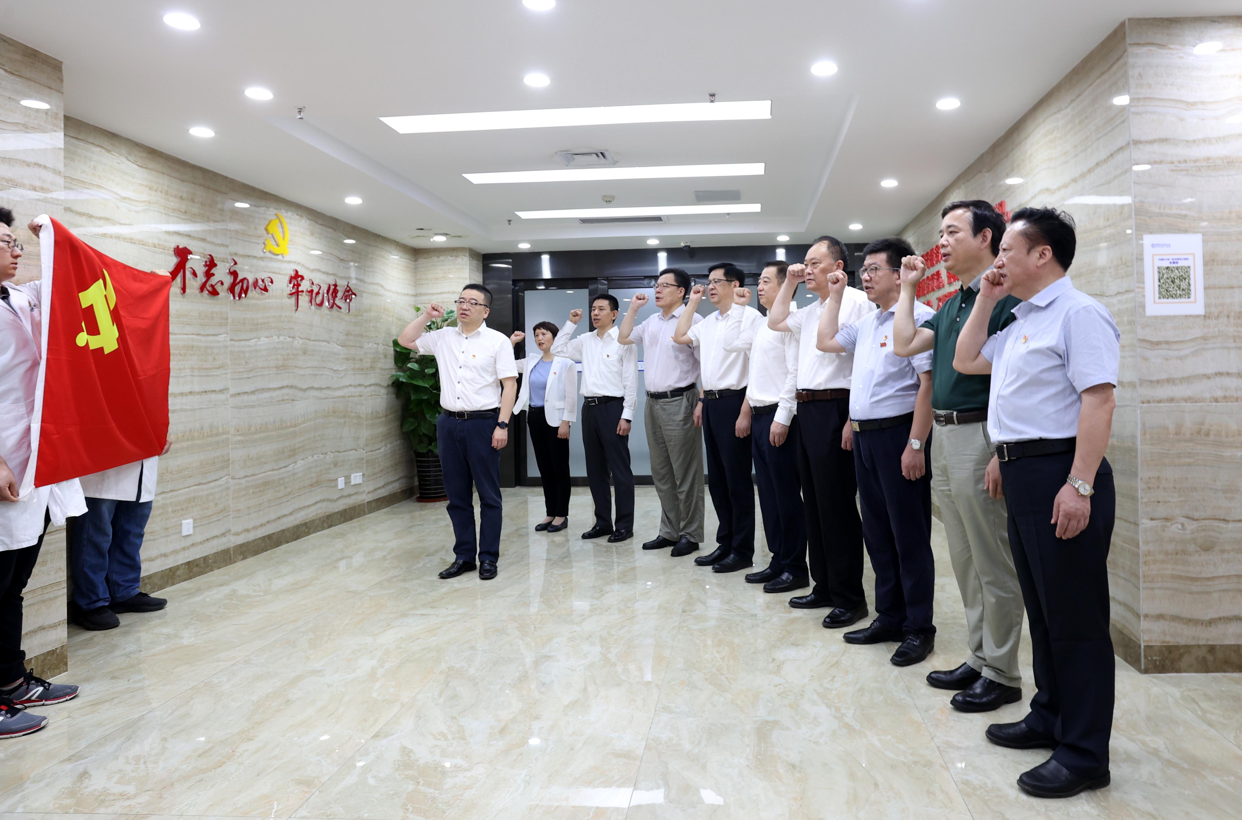 庆祝大会开始前,附一院党委中心组在鲜红的党旗前重温入党誓词。在党委书记刘连新的领誓下,党员院领导庄严地举起右手,用饱满的激情、响亮的声音,重温当年的决心和信念。刘连新表示,要在重温入党誓词中感悟初心、坚定初心、以实际行动践行为人民谋幸福,守护百姓健康的使命。