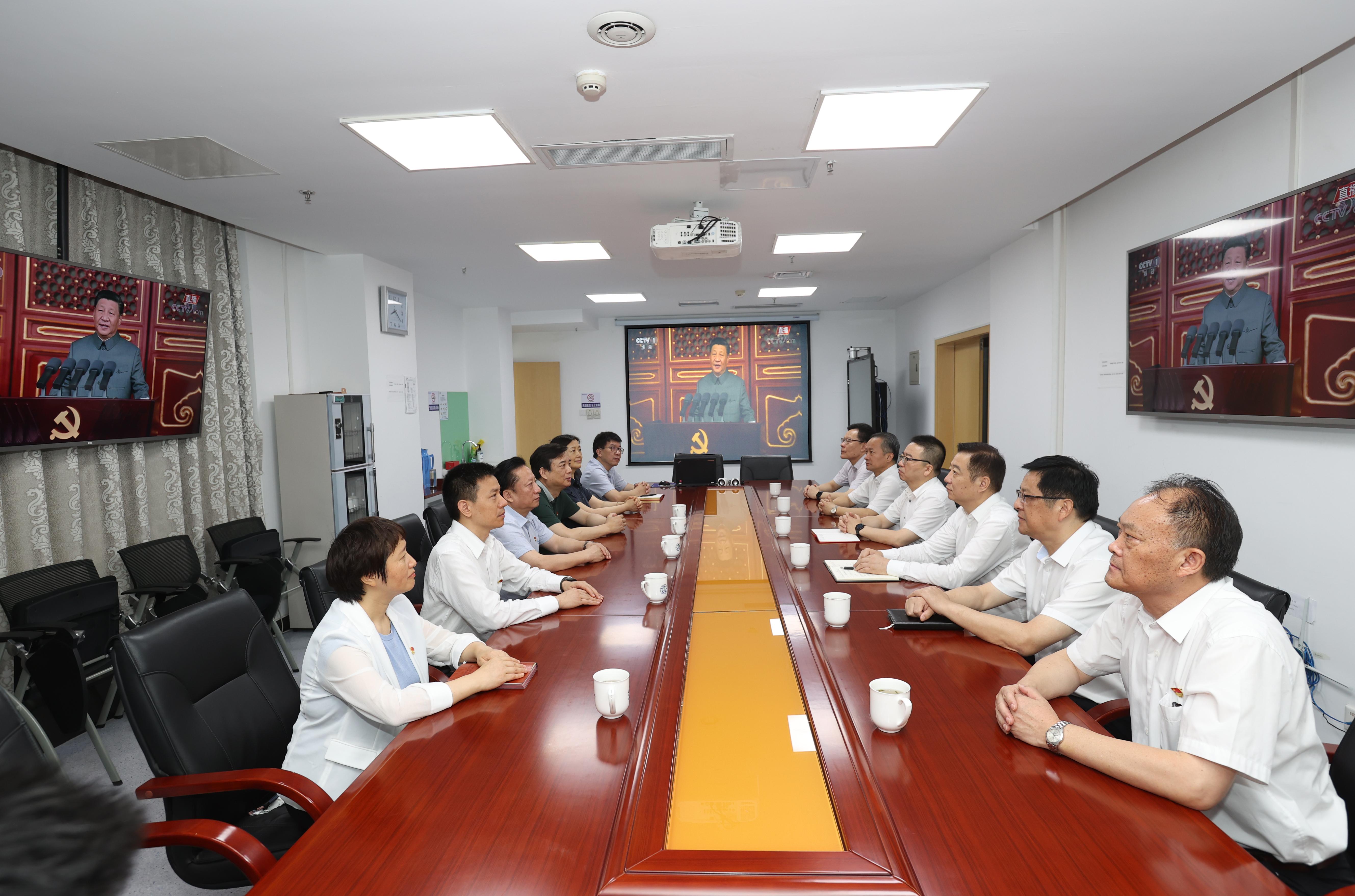 7月1日上午8时,庆祝中国共产党成立100周年大会在北京天安门广场隆重举行,中共中央总书记、国家主席、中央军委主席习近平发表重要讲话。附一院领导班子成员在行政楼七楼东会议室,集中观看庆祝中国共产党成立100周年大会直播。
