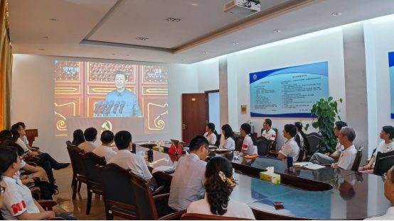 在二楼会议室,校出版社理论学习中心组召开集中学习扩大会议,集中收看庆祝中国共产党成立100周年大会。出版社领导班子、中层管理干部、全体党员共同观看大会直播,认真学习习近平总书记在庆祝中国共产党成立100周年大会上的重要讲话。