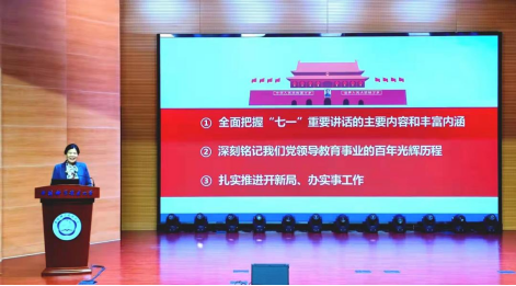 黄素芳带领全体师生回顾了习近平总书记“七一”重要讲话的主要内容和丰富内涵。她指出,习近平总书记“七一”重要讲话脉络清晰、逻辑严谨、亮点纷呈,从宣示实现第一个百年奋斗目标到明确实现中华民族伟大复兴,从论证党取得的伟大成就到伟大建党精神,充分证明了我们党对共产党执政规律、社会主义建设规律、人类社会发展规律的认识提高到了新高度,百年大党风华正茂,百年初心历久弥坚。黄素芳强调,我们要深刻领会“七一”重要讲话精神的政治意义、理论意义和实践意义,切实将“七一”重要讲话精神融入到学习和工作中。