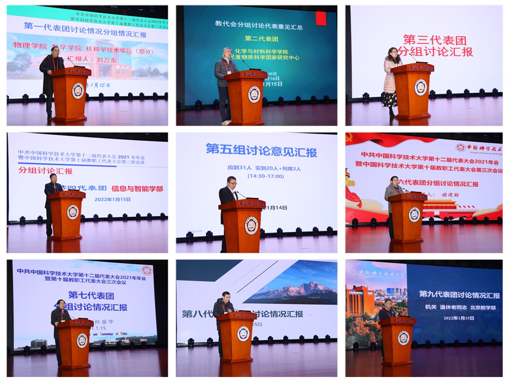 大会首先听取了各代表团分组讨论情况汇报。代表们认为,校党委工作报告、行政工作报告内容详实、高屋建瓴、振奋人心。2021年,学校认真贯彻落实习近平总书记关于中国科大系列重要指示精神,围绕“潜心立德树人、执着攻关创新”两大核心任务,党的建设和学校各项工作稳步发展,取得了可喜的成绩。聚焦学校“十四五”发展和中国特色、世界一流大学的建设目标,各代表团就加强高层次人才的教学职责,建立教代会代表团常态化工作机制,实施内外兼修的校园管理,不断深入和细化党建工作,优化办公用房分配,加强学校和附一院的深度融合等方面提出宝贵意见和建议。