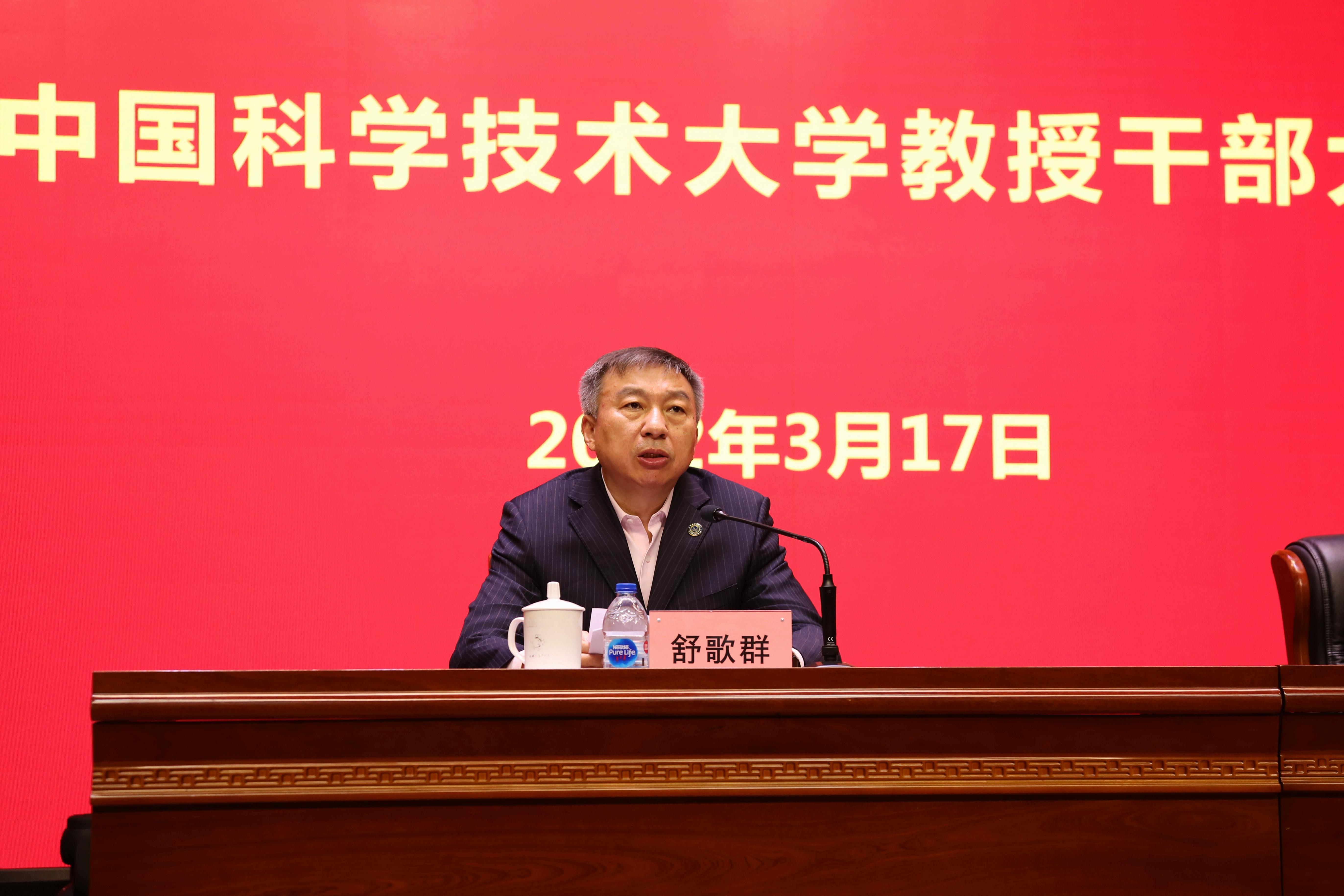 3月17日上午,中国科大在东校区水上报告厅召开教授干部大会,传达学习习近平总书记重要讲话和全国两会精神。校党委书记舒歌群主持会议并讲话。校长包信和,在校校领导、两院院士、教授及相当专业技术职务人员,校学术、学位、教学委员会委员,校党委、纪委委员,各学院、系、重点科研机构、机关各部门、直属单位党政负责人,全国、安徽省人大代表、政协委员,各民主党派负责人参加会议。