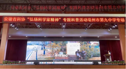 为深入贯彻落实习近平总书记关于大力弘扬科学家精神的重要指示批示精神以及中共中央办公厅、国务院办公厅印发《关于进一步弘扬科学家精神加强作风和学风建设的意见》《全民科学素质行动规划纲要(2021-2035年)》,大力弘扬科学家爱国、创新、求实、奉献、协同、育人的精神,在全社会营造崇尚科学、崇尚科学家的氛围,中国科学技术大学出版社与安徽省科协共同举办“弘扬科学家精神”进校园活动,于3月2日至8日分别走进安徽省亳州第九中学、亳州市第三十一中学、阜阳师范大学附属中学、阜阳苗桥小学、霍邱县第一中学、金寨县现代产业园实验学校等六所学校进行科学家故事分享。此次活动有近5000多名师生参与。
