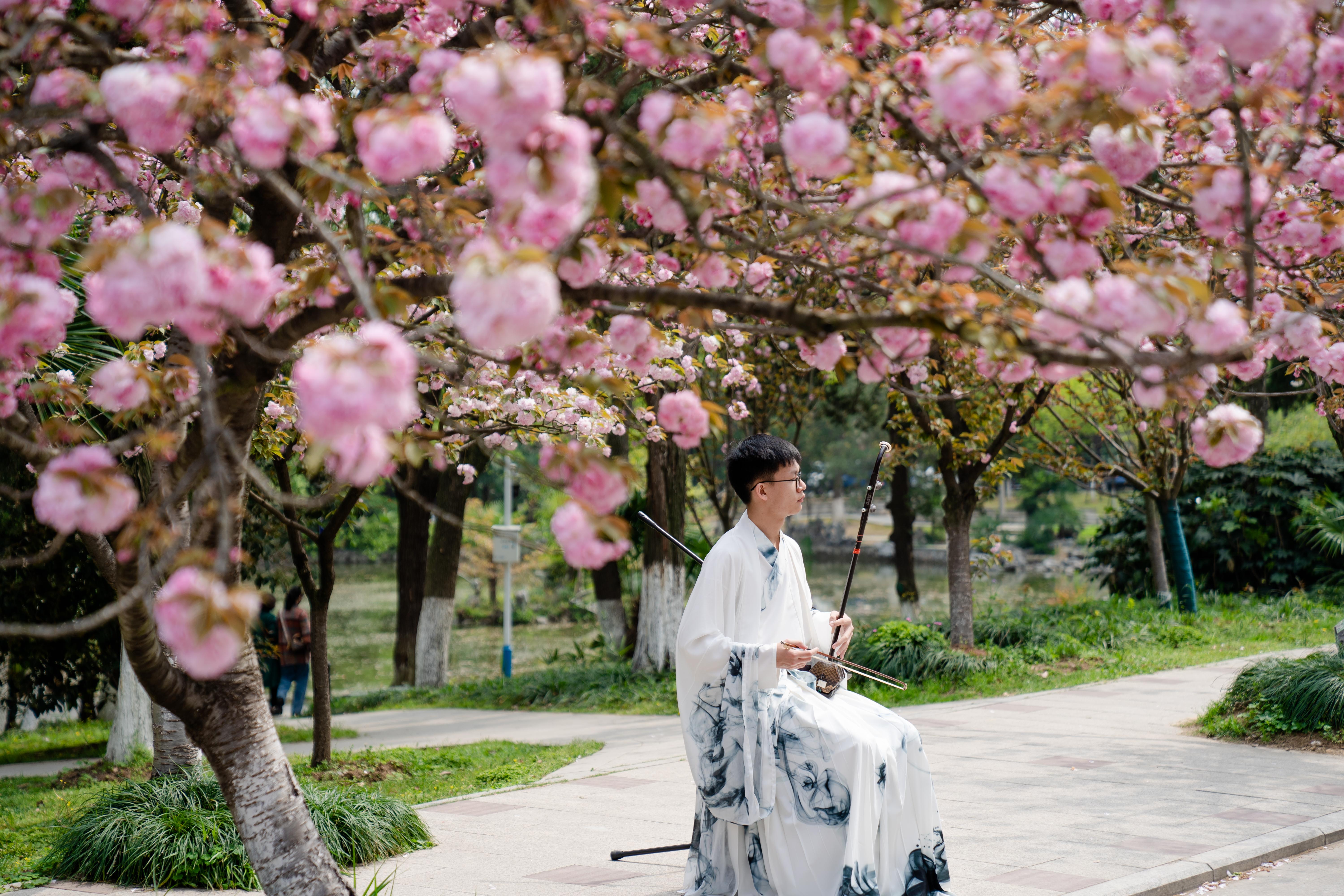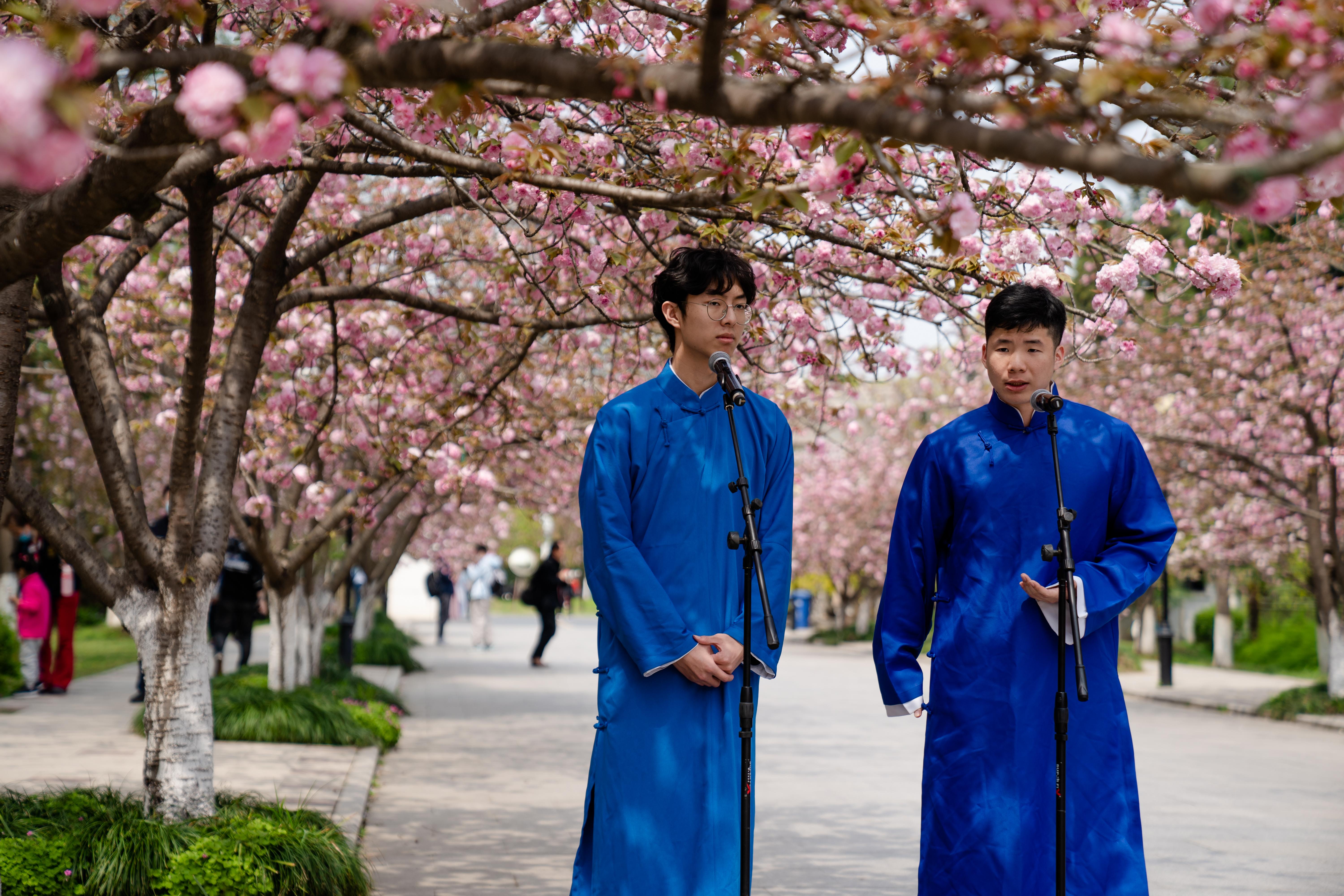 樱花树下,二胡独奏《簪花人间》宛转悠扬,音乐与美景融为一体,令人心旷神怡。几十年来,无数的科大人都曾路过这樱花树下,然后带着“红专并进,理实交融”的校训奔赴远方。但无论走到哪里,我们都忘不了那句“永远科大人”。“理想比天高,‘墨子’太空遨!您听听,我这句怎么样?”两名学生表演的相声《永远科大人》,以“红专并进,理实交融”的科大校训八个字为字头作诗,引得师生纷纷驻足。他们本色精彩的表演,也赢得了网友的交口称赞。