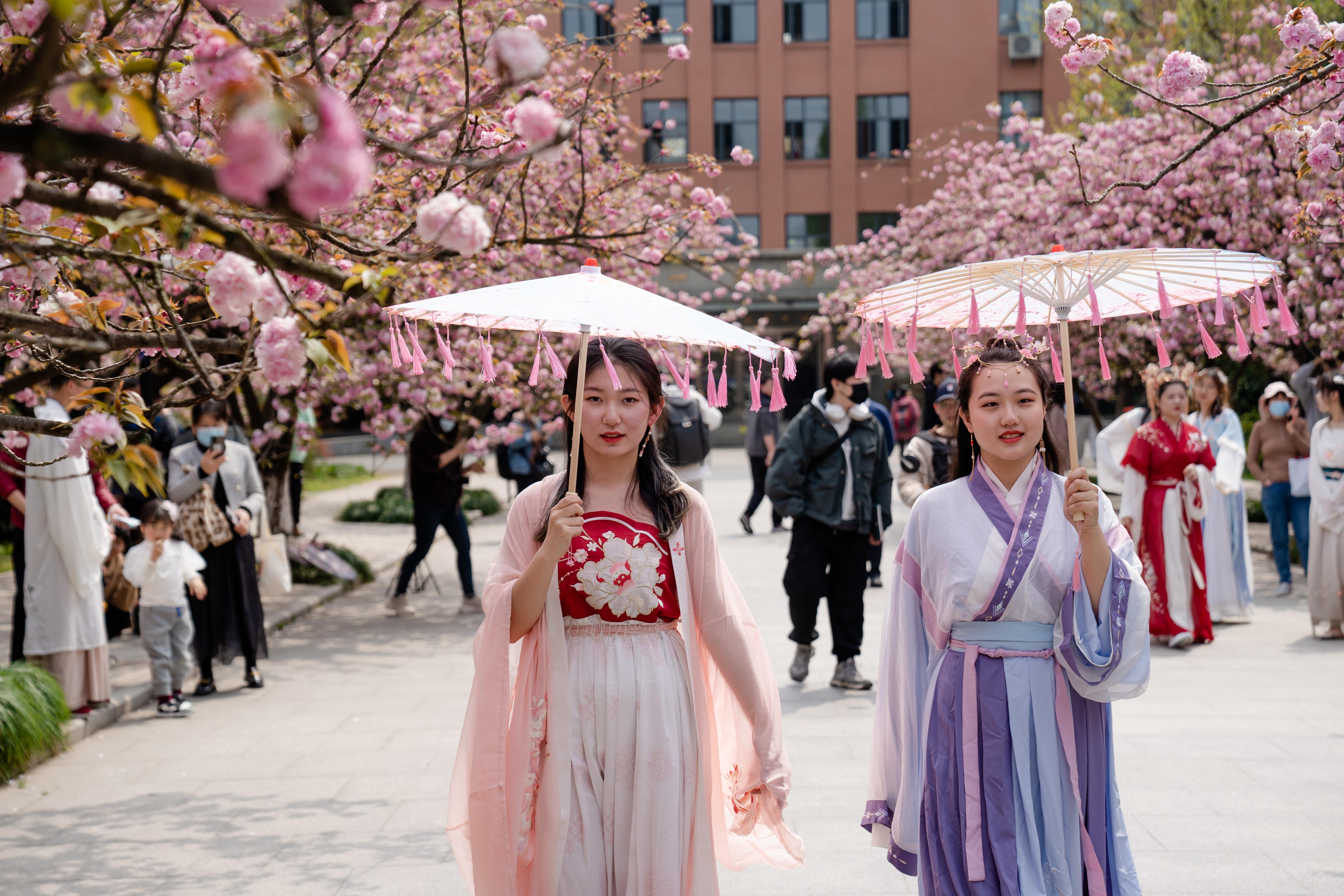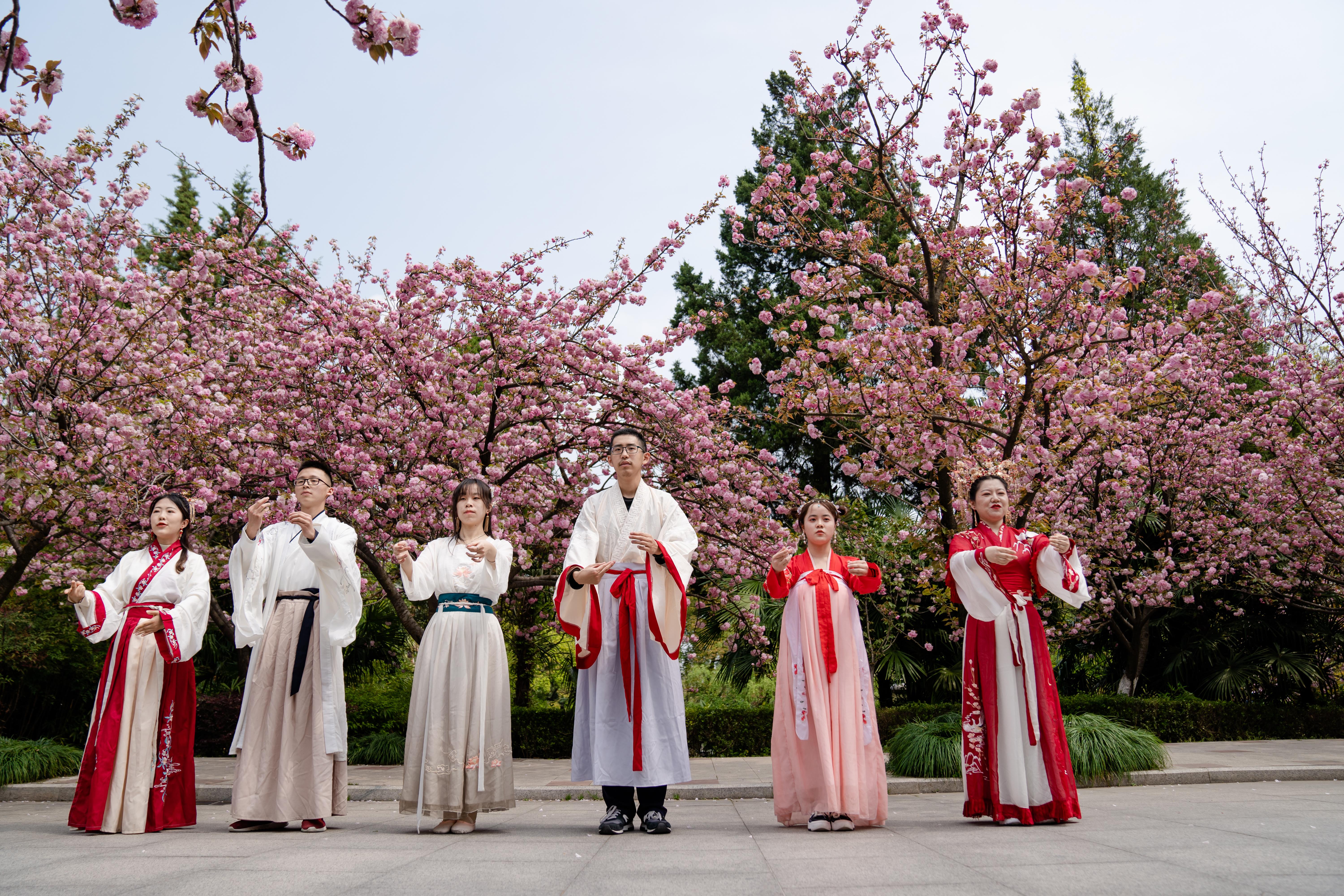“云赏樱”直播活动,从东区老北门开始。1970年,中国科大刚刚南迁合肥时,广大师生就是从老北门起步,开启了二次创业的新征程。活动现场,身着汉服的7名校舞蹈团成员,衣袂飘飘地跳起伞舞《青花瓷》,轻柔的舞姿再现盛世古风,拉开了整场直播的序幕。