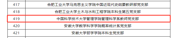 近日,教育部思想政治工作司公布了第二批新时代高校党建示范创建和质量创优工作和首批高校“双带头人”教师党支部书记工作室建设单位验收结果,中国科学技术大学管理学院管理科学系教师党支部顺利通过第二批“全国党建工作样板支部”验收。