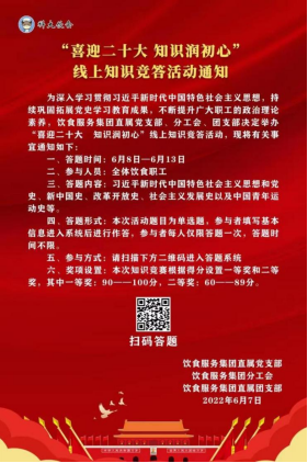 6月8日至13日,饮食服务集团直属党支部、分工会、团支部举办“喜迎二十大 知识润初心”线上知识竞答活动。