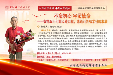 8月29日晚,由学校关心下一代工作委员会、计算机科学与技术学院党委和离退休干部党委联合主办的老科学家走进学院专题报告会在东区第二教学楼顺利举行。校关工委委员、老科学家报告团成员杨寿保教授应邀作题为《不忘初心 牢记使命——在党五十年的心路历程,兼谈计算机学科的发展》的专题报告。计算机科学与技术学院2022级本科新生近200人参加了本次活动,活动由计算机科学与技术学院党委副书记宫晓梅主持。