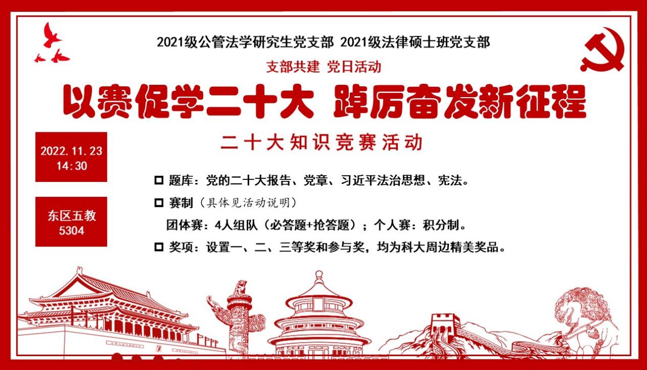 为在广大党员中掀起学习党的二十大精神热潮,以赛促学、以学促用,11月23日,2021级公管法学研究生党支部和2021级法律硕士班党支部联合开展“以赛促学二十大,踔厉奋发新征程”——二十大知识竞赛主题党日活动。两支部全体党员、入党积极分子参与活动。活动由2021级法律硕士班党支部车致远主持。