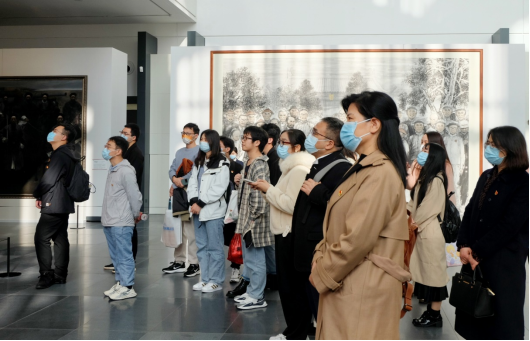 在讲解员的带领下,大家首先共同参观了“安徽省重大历史题材美术作品展”。安徽省重大历史题材美术作品展用雕塑、油画、国画等形式集中展现了自近代以来安徽省波澜壮阔、气势磅礴的历史进程。同学们在一幅幅壮美画卷中感受到了艺术家们作品中呈现的民族精神和家国情怀,感悟到了历史长河下博大精深的文化底蕴。接着,在场师生还共同参观了“青春万岁:新中国美术的青年时代——中央美术学院美术馆藏品专题展”。1949年新中国成立后的这些优秀艺术家们,将自己的青春奉献到了全国各地艺术院校的创建之中,带动各地美术的发展。同学们在参展中体会到了新中国成立以来欣欣向荣的时代面貌,并被艺术家们的作品表现形式所震撼。