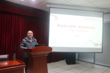 12月14日下午,校学习贯彻党的二十大精神宣讲团成员、我校马克思主义学院教授钱斌在东区图书馆四楼报告厅作学习贯彻党的二十大精神宣讲报告。报告会由图书网络档案联合党总支书记汪忠诚主持,图书馆信息服务党支部、流通服务党支部,网络信息中心党支部,档案文博院党支部全体党员以及各单位业务骨干现场聆听了报告。