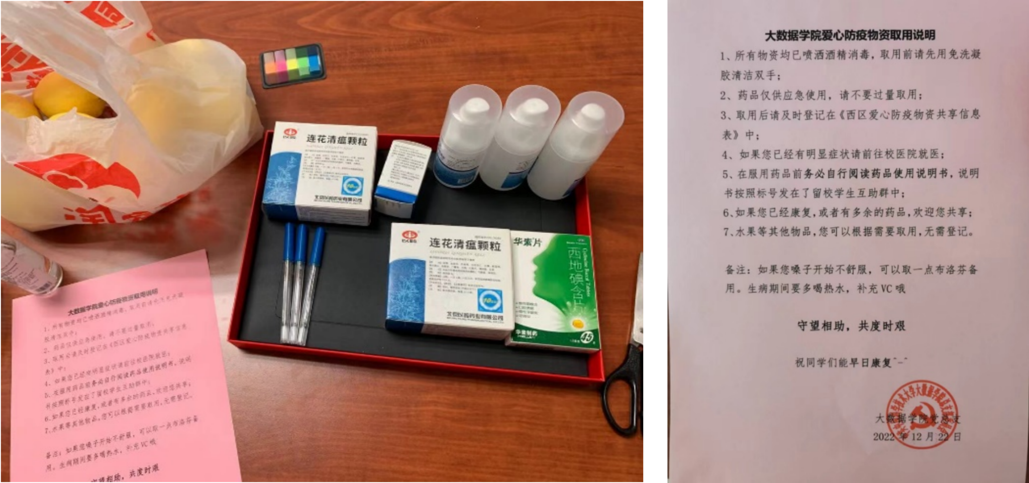 2022年12月以来,疫情形势急速变化,校内每日新增感染者越来越多,为了携手同心,共同守护同学们的平安健康,大数据学院党总支建立起留校学生互助群,积极筹备爱心防疫物资,并倡议同学们坚定信心、互帮互助,为同学们送上温暖关爱。