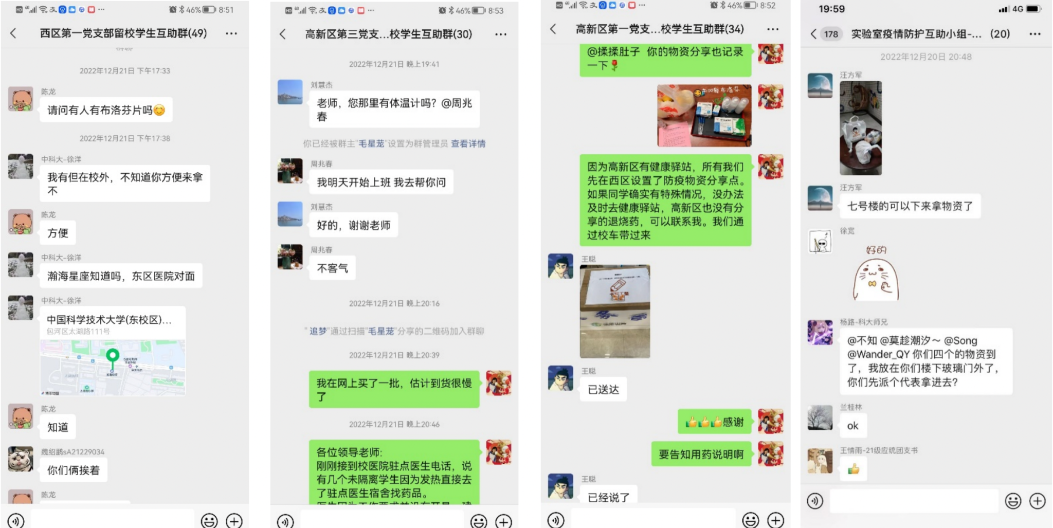 随着感染人数大幅上涨,12月20日,学院党总支紧急召开线上会议,专题讨论如何为留校生病的同学们做好生活保障工作。随即,根据会议精神,学院以基层党支部为单位建立起留校学生互助群,为了确保每位留校学生都加群,每位留校学生都被关注,学院还发动了学工队伍的力量,每位班主任都加入了相应的微信群中。