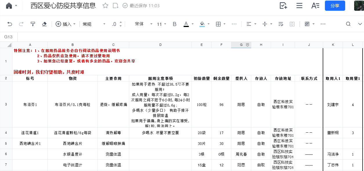 学院党总支分别建立了西区和高新区的爱心防疫物资共享文档。在西区健康驿站基本饱和的情况下,学院的老师同学们首先把西区的物资共享点建立起来,并非常贴心地提供了爱心防疫物资的取用说明。还在生病的学院党总支副书记阳思老师,紧急从家里送来了布洛芬、莲花清瘟和水果等物资。我院兼职辅导员、校医院办公室主任周兆春老师也通过协调,从校医院调配了5只温度计供大家使用,并细心为大家提供用药说明和医护指导。