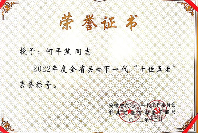 2月23日,全省关工委工作会议在合肥召开。我校何平笙教授被安徽省关心下一代工作委员会、中共安徽省委老干部局授予2022年度全省关心下一代“十佳五老”荣誉称号。