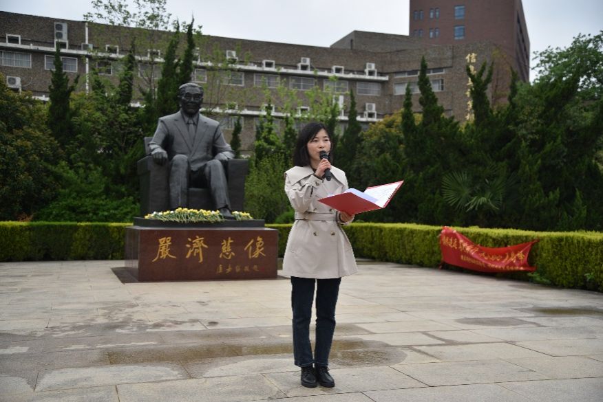 上午九时,蒙蒙细雨,2022级全体同学在严济慈先生塑像前陆续汇集,在核科学与技术学院2022级研究生陶莉的主持下,同学们怀着深切的缅怀和诚挚的敬意,依次向严济慈先生塑像献花,并集体向以严济慈先生为代表的老一辈科学家们致哀一分钟。