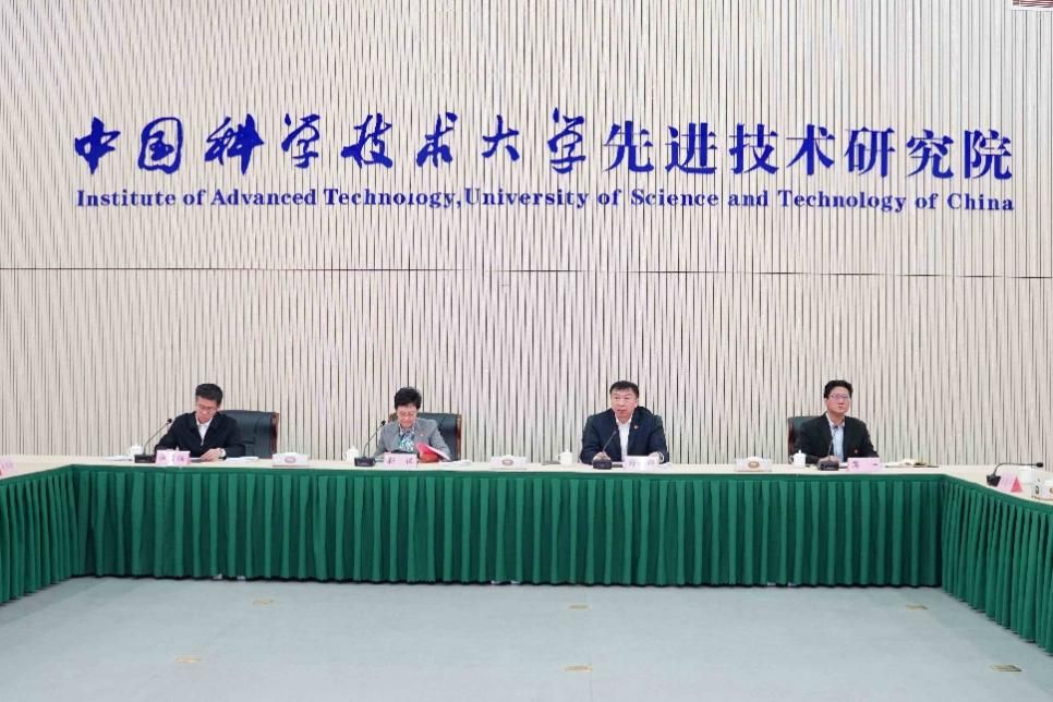 会上,与会人员重温了习近平总书记2016年考察中国科大视频。舒歌群领学习近平总书记关于中科院、安徽省、中国科大的系列重要指示精神。校党委常委、副校长吴枫,校党委委员、合肥微尺度物质科学国家研究中心党委书记王兵,校党委委员、团委书记杨晓果分别结合工作实际作交流发言。