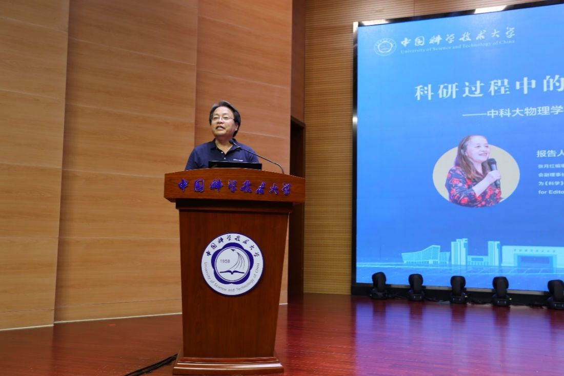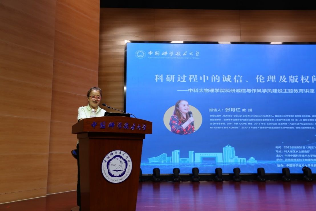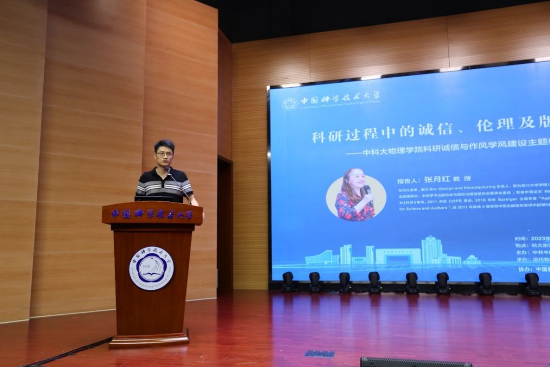 为扎实推进学习贯彻习近平新时代中国特色社会主义思想主题教育,全面贯彻落实习近平总书记关于“要营造良好学术环境,弘扬学术道德和科研伦理”的重要论述精神,5月31日下午,中国科学技术大学物理学院在水上报告厅开展“科研诚信与作风学风建设教育”主题党日活动,邀请《浙江大学学报(英文版)》前总编张月红教授作题为《科研过程中的诚信、伦理及版权问题》的主题讲座。近代物理系粒子物理与原子核物理教工党支部书记石发展主持此次讲座,来自全校感兴趣的师生和科研人员听取了讲座。