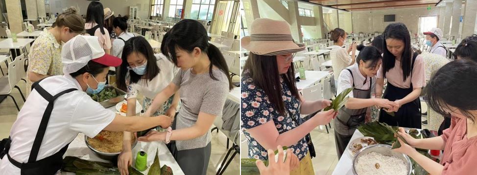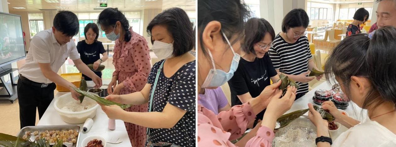6月20日下午,饮食服务集团联合党政办、物理学院,在东区教工餐厅举办“弘扬传统文化 体验劳动之美”迎端午活动,20余名老师参加了本次活动。活动伊始,在暖场视频介绍下,大家对端午包粽子、戴香囊、喝雄黄酒等传统民俗有了直观的认识。接着,芳华餐厅经理余海波作为指导老师,为大家示范包粽子过程,并进行详细讲解。填料、扎捆、成型,老师们将对端午的浓浓祝福也融入了小小的粽子里。现场一片欢声笑语,洋溢着浓烈的节日氛围。