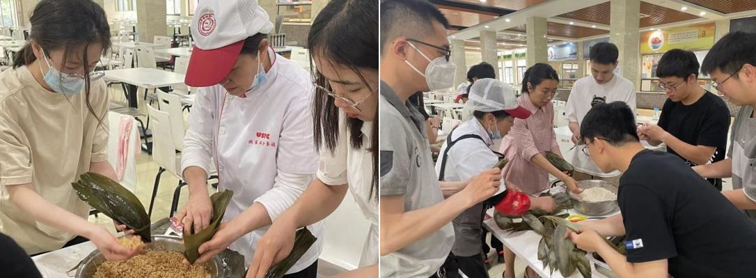 5月27日与6月10日下午,来自地空学院和马克思主义学院共计40名同学,在东区学生食堂开展“迎端午、包粽子”活动。活动现场,桌子上整齐地摆放着泡好的糯米、粽叶、蜜枣、咸蛋黄、五花肉等各种包粽子所需的材料。活动开始,两位经验丰富的食堂指导老师现场演示了包粽子的技巧,她们手法娴熟,一卷一叠,一只只小巧的粽子脱颖而出。同学们在老师的指导下,迅速掌握包粽子小窍门,“在家里爸妈教我包粽子怎么也学不会,在食堂一下就学会了,还是师傅教得好!”一位同学一边包粽子一边兴奋地说道,收获着劳动的快乐。