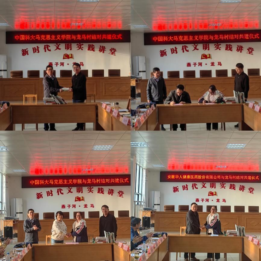 会上,学院原理纲要教工党支部、基础概论教工党支部,安徽华人健康医药股份有限公司所属国胜大药房党支部,分别与龙马村签订基层党组织结对共建协议书,杨保国代表学院向龙马村捐赠农业农村相关图书资料。