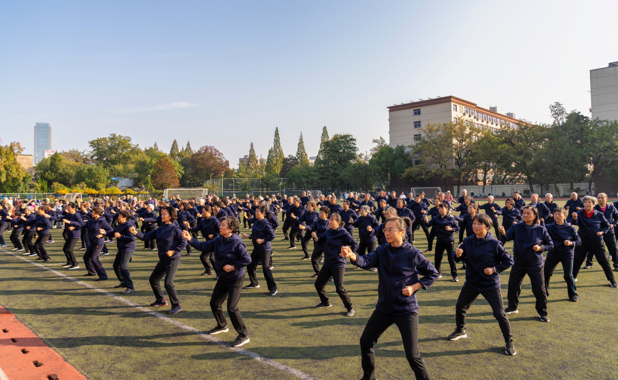 随后,老年体协和各党支部行政片的老同志带来精彩的八段锦展演。老同志们身着统一服装,精神抖擞地展示这套经典的健身功法。他们动作舒展流畅、神态悠然自得,诠释了八段锦“意动行随神形兼备、松紧结合动静相兼”的特点,赢得在场观众的阵阵喝彩。本次八段锦展演不仅弘扬了中华传统文化,更增强了老同志身体素质,展现了我校离退休教职工良好的精神风貌。