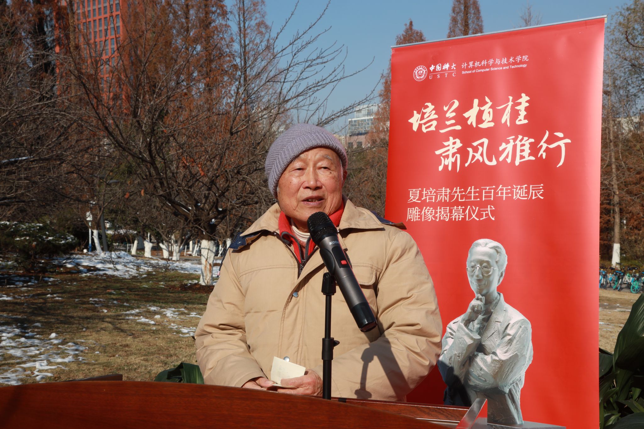 家属代表杨跃民表示,母亲(夏培肃)将自己奉献于推动中国计算机事业的发展,也与中国科大有着紧密的联结。作为家属,他能够现场见证夏培肃先生的雕像竖立于中国科大的校园内,感到非常欣慰,并对建设雕像时来自各方的支持表示感谢。他希望能够让更多的学子受到夏先生的感召,将她的自主创新、甘为人梯的崇高精神在中国科大的校园里不断传承。